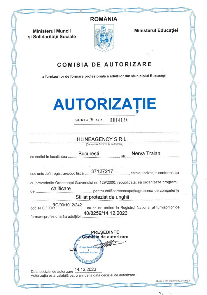Avand numarul de ordine in Registrul National al furnizorilor de formare profesionala a adultilor 40/8259/14.12.2023, cursul stilist protezist unghii este recunoscut la nivel national, dar si in orice alta tara din U.E.